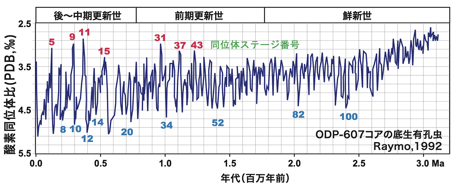 fig.4──過去300万年間の有効虫同位体比の変動。Raymo (1992)☆1を一部修正。約4万年と10万年の周期が認められ、それぞれ公転軌道の離心率と地軸の傾斜の周期に対応する。全てのピークに番号が付けられ、奇数は間氷期、偶数は氷期に対応する。