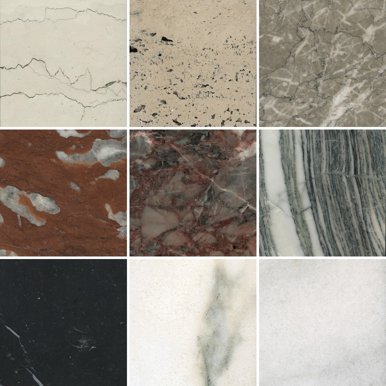 ◆石灰岩の多様な色彩 ここで是⾮多様な⽯灰岩の⾒た⽬を紹介したい。意識して見たことがなくても「あれは⽯灰岩だったんだ?」と気づくものが必ずあると思う。fig.11〜19の⽯材は、⽮橋⼤理⽯株式会社(岐⾩県⼤垣市)に提供・撮影協⼒していただいたものである。サンプル画像の⼤きさはすべて10cm×10cmである。 まず、⽯灰岩は多様な⾊を⾒せる。基本はグレー、ベージュ、クリーム⾊などが多く、イタリア産の「ペルリーノ・キァーロ」[fig.11]、「トラベルチーノ・ロマーノ」[fig.12]、徳島県産「淡雪(あわゆき)」[fig.13]をはじめ、この⾊みだけでも多数の⽯材がある。しかし、他にも様々な⾊があることはご覧の通りで、⾚⾊が⽬⽴つフランス産「ランゲドック」[fig.14]、岐⾩県産「更紗(さらさ)」[fig.15]、緑⾊の縞を挟んでいる⾼知県産「渓流(けいりゅう)」[fig.16]、ほぼまっ⿊な岐⾩県産「美ノ⿊(みのくろ)」[fig.17]、クリーム⾊の茨城県産「⽔⼾寒⽔(みとかんすい)」[fig.18]、真っ⽩の⼭⼝県産「霰(あられ)」[fig.19]まで幅広いカラーバリエーションがある。発⾊の原因はひとつではないので厳密には語れないが、⾚みが強いものは多くの場合は酸化鉄の⾊であろう(「べんがら」という⾚い塗料が知られているように)。緑⾊に寄るものは緑泥⽯や⾓閃⽯などの緑⾊の鉱物を含んでいることが多く、それは⽯灰岩層の間に例えば⽕⼭灰層など炭酸カルシウム以外の地層が挟まれるとできるだろう。⿊い⽯灰岩は炭素を主成分とする物質を多く含むと思われ、それはおそらく⽣物の有機物由来だろう。そして純⽩を呈する場合は結晶質であることが多く、それは炭酸カルシウムが地中の熱に応じて結晶し直した際に不純物が結晶の外に追い出され、より純粋な炭酸カルシウムの結晶ばかりになった結果である。本稿では⽯灰岩と総称しているがこの再結晶した⽯灰岩が本来の狭義の⼤理⽯である。