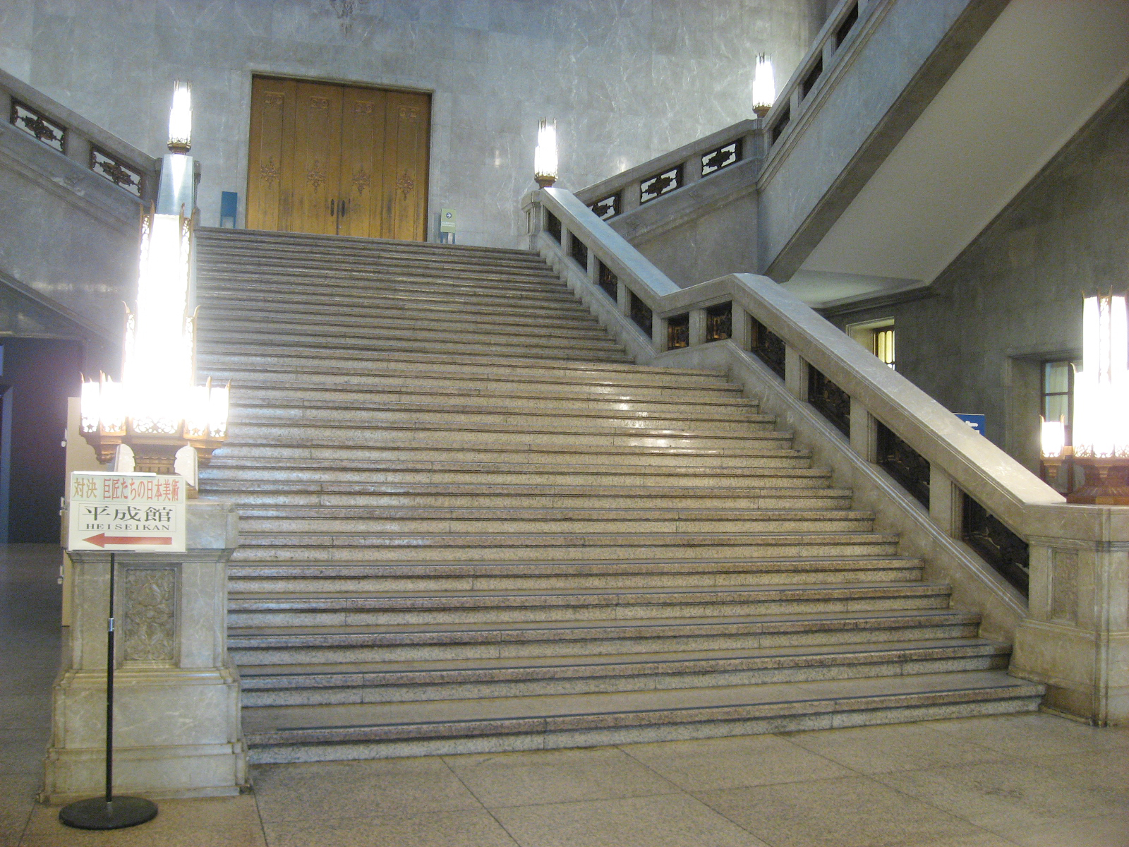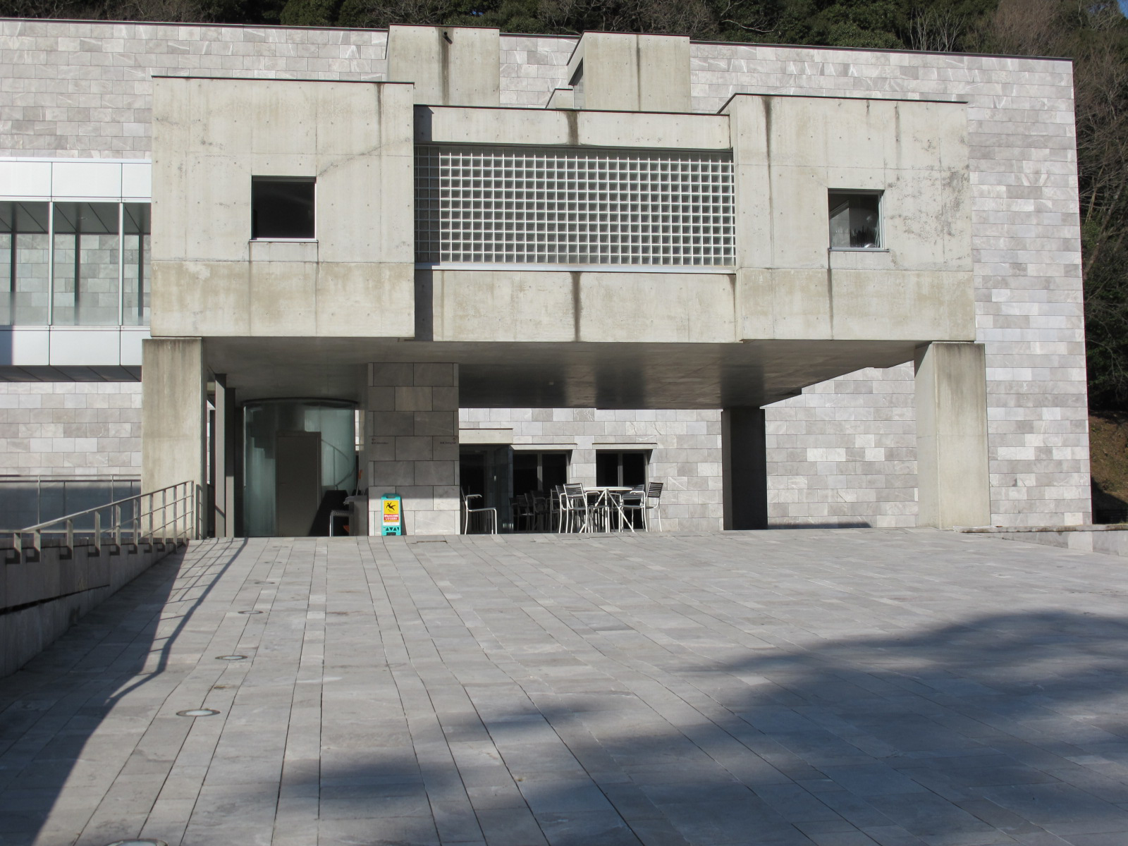 ◆石積みから石張りへ 組積造は素朴で趣があって⼤変魅⼒的であるが、現代の⽇本のまちの中で⼈が住む建物としてはほとんど⾒られない。その⼤きな理由は耐震性の評価が難しいからであろう。災害⼤国ニッポンでは致し⽅ないことである(なお、⽇本で昔から⽯が建物に、特に⼈が住む建物に使われてこなかった理由は、耐震性以外にも夏の暑さのためだとか⽯⼯集団がいなかったとかさまざまに考察されているので他に譲る)。このため、現在私達が⽬にする建築の中の⽯は、板状にスライスして磨かれた⽯材が圧倒的に多い。⽇本に⻄洋建築が導⼊されたのは明治時代からで、明治中後期には⼤型の建物は鉄筋コンクリート造等となり始め、⽯材は⾻組みではなくなっていった。したがって、⽇本⼈の多くは最初から板材・化粧材として、あるいは建築物を美しく彩るための素材として、建築⽯材と出会っていたと考えることもできる。 ◆石灰岩は主に内装に 建築⽯材として使われる岩⽯には⽕⼭岩、深成岩、凝灰岩、砂岩など各種あるが、その中で⽯灰岩を特徴づけているのは何といってもその外観の⾊と模様の多様さである。また、おそらく国会議事堂の建設⼯事を契機として、⽇本ではメンテナンスフリーな花崗岩を外壁に、⾬に弱い⽯灰岩は主に内装に使うことが⼀般的となった(全国⽯材⼯業会、1965)。雨に弱いというのは、⽯灰岩が⾬でわずかに溶けて光沢が消えるからである。従って、建築物の中で石灰岩が大規模に使われる場所は訪問者を迎え入れるための豪華な演出をしたい場所、例えば玄関ホール付近や大階段などが多い。fig.8は《東京国⽴博物館》(1937)の⼤階段で、徳島県産の「茶⻯紋(ちゃりゅうもん)」という⽯材が全⾯的に使われていて⾒事である。⾬に弱いとはいっても光沢が消える程度なので、屋外で使⽤する例もなくはない。fig.9の《秋吉台国際芸術村》(1998)は内装も外装も全⾯的に秋吉台産の⽯灰岩「霞(かすみ)」を使っている。