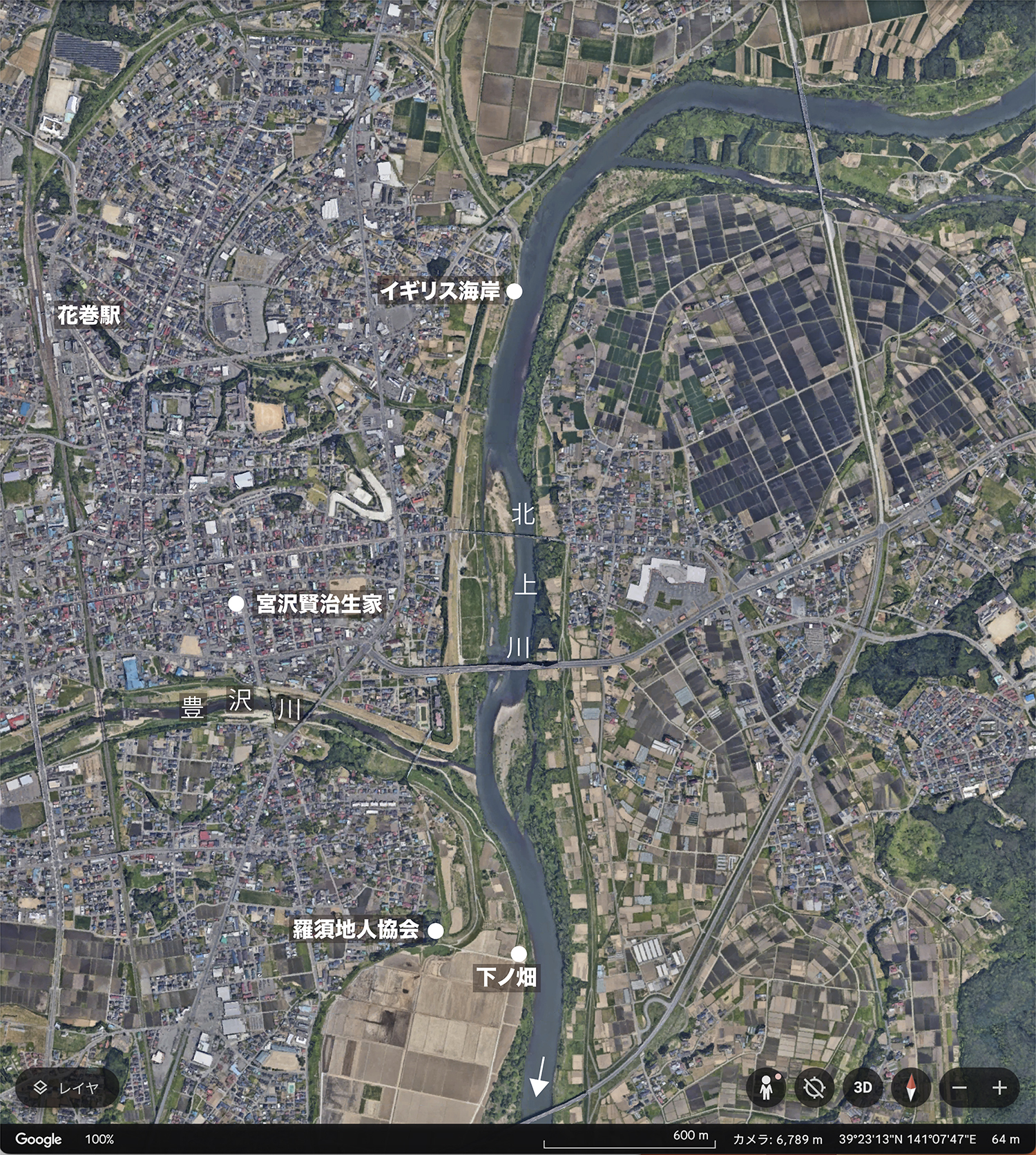 fig.1──現在の花巻市と賢治ゆかりの地(Google Earthより引用・修正)