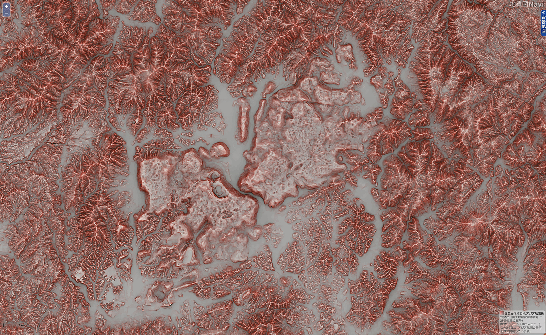 上の地図で青色が石灰岩の分布域。下の赤色立体地図と対応させると、石灰岩分布域の地形がほかの場所と大きく異なることがわかる。