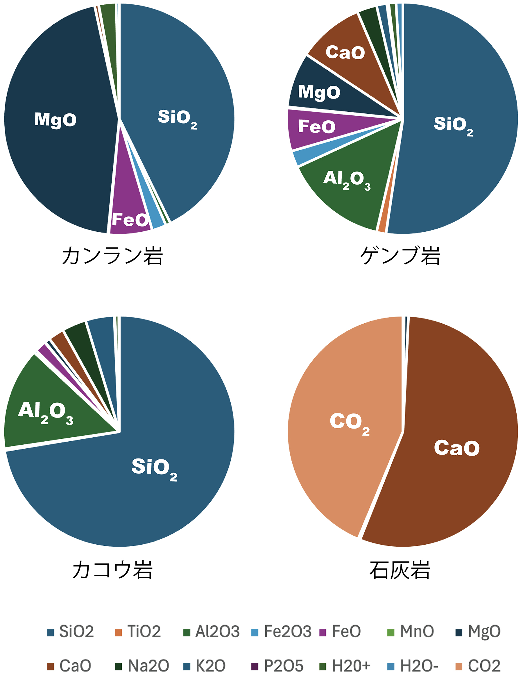 ここではカンラン岩、ゲンブ岩、カコウ岩、石灰岩として、それぞれ産総研の岩石標準試料であるJP-1、JB-1、JG-1、JLs-1で代表させ、同研究所の推奨値を参照した(産総研地球化学標準物質岩石標準試料データベース:https://gbank.gsj.jp/geostandards/welcomej.html)。