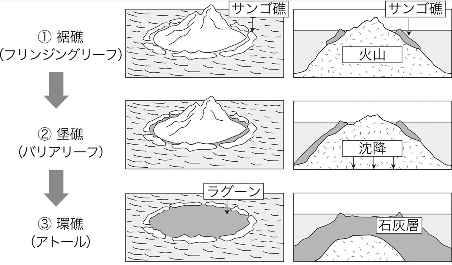 今回の主役は賢治なのだが、どうしても彼が誕生する14年前に没しているダーウィンを登場させざるをえない。ダーウィンは後半生、ミミズと土壌の形成に関する研究に精魂を傾けたので、その意味で賢治とつながりがあるといえる。しかし、ここで紹介するのは、彼のキャリアにおける最初の研究といえるものだ。 鈴木紀之著『ダーウィン──「進化論の父」の大いなる遺産』★8を読んで、もっとも勇気づけられ安堵したのは、ダーウィンも人の子であることを知ったことだ。大学卒業後すぐに参加したビーグル号による世界一周航海の終盤、彼はちゃんとホームシックになり、かつどうにもやる気が出ない心持ちになっている。故郷を離れすでに4年も経過し、当然といえば当然かもしれない。しかし、そんな状態でも自暴自棄におちいらず、きちんと観察・記録をしているダーウィンはやはりすばらしい。 ダーウィンが参加したビーグル号航海自体の最大の目的は南アメリカ諸国沿岸の測量・海図作成である。それを無事終え、太平洋・インド洋を西へと横切りつつ、いくつかの海洋島を観察する機会に恵まれた。ダーウィンは大陸から遠く離れた外洋の島々とそこに発達するサンゴ礁を生まれてはじめて目の当たりにした。サンゴ礁の形態はいくつかの種類に分類できるようにみえる。現在それらは、裾礁、堡礁、環礁という名称がついている[fig.5]。自然認識の基本は分類、とすればそこまでは当然といえるだろう。