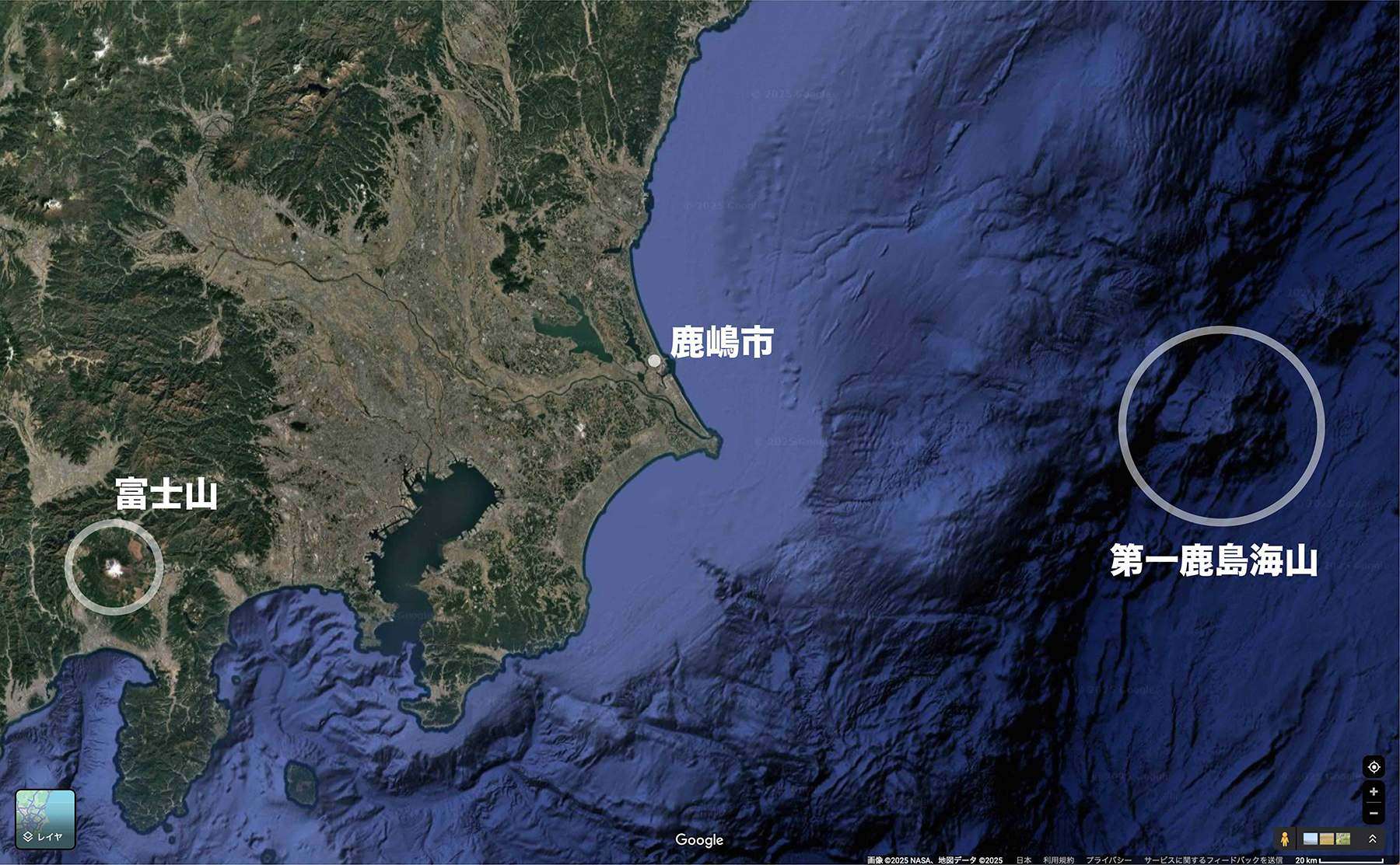 fig.7──今まさに日本海溝に沈み込まんとしている第一鹿島海山(Google Mapより引用・修正)。