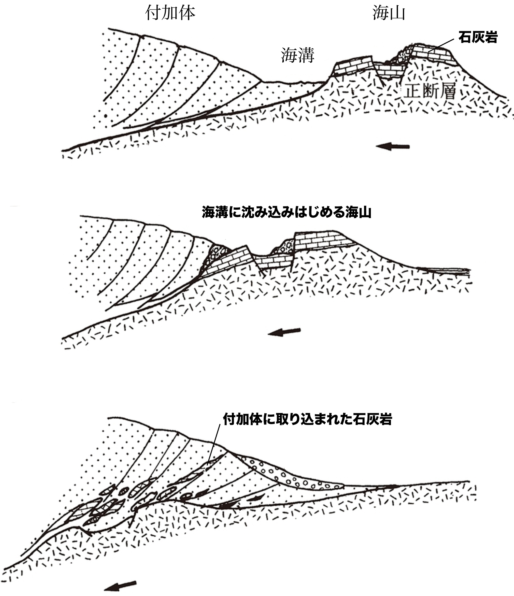 Much of the Japanese archipelago is composed of accretionary complexes, and most of the limestone found in Japan is contained within these complexes. Calcareous reefs formed on oceanic islands or seamounts were transported by plate motion and accreted onto the convergent margin; as a result, fragments of these reefs now crop out in scattered locations throughout Japan.